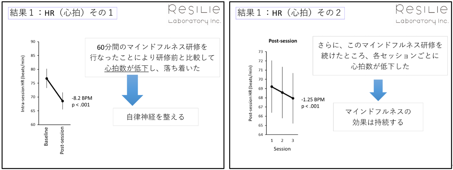 1. レジリエ研究所のデザインによる60分間のマインドフルネス研修を行なったことにより研修前と比較して心拍数が低下し、自律神経を整えることが示唆された。(結果1 その1)