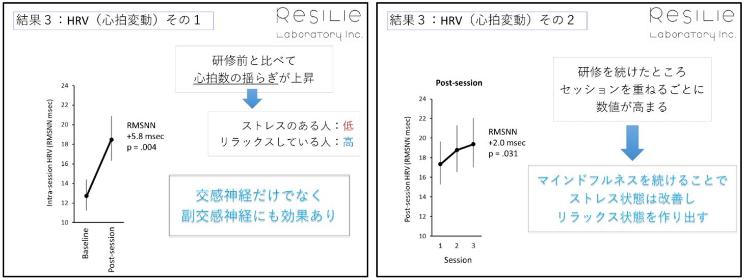 2. さらに、このマインドフルネス研修を続けたところ、各セッションごとに心拍数が低下し、マインドフルネスの効果は研修後も持続することが示唆された。(結果1 その2)