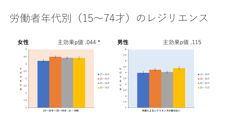 1. 男性はキャリアを通してレジリエンスの合計値に変動があまりないのに対し、女性は35歳~44歳が最もレジリエンス力が高い。つまり、女性は35歳~44歳にレジリエンス度を必要とする複雑で高度な仕事や、体力を使う子育てと仕事の両立などをこなす力が備わっていると解釈されます。(図1)