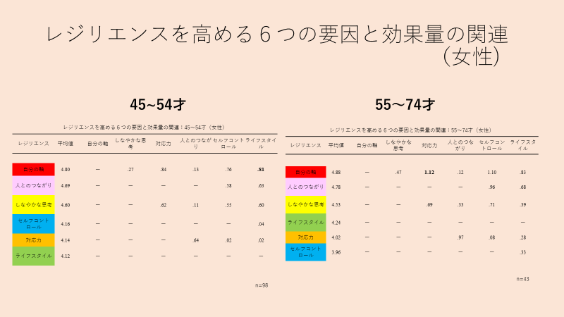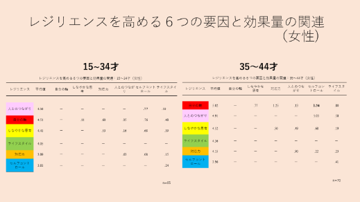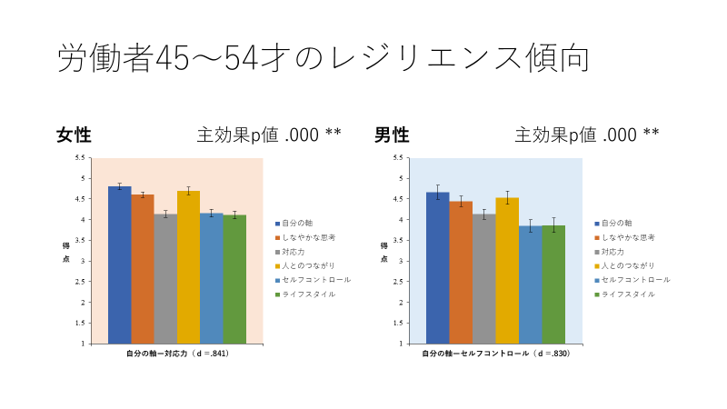 2. 一方、45歳以降の女性では、6つあるレジリエンス要素の中の、「対応力」が低下します。これは、子育てなどによるキャリアの中断により、職場ではキャリアの男女差がでて、女性はルーティーンワーク主流で、新しいプロジェクトを任されるということが少なく、「対応力」を研磨する場がないという可能性があります。(図2)
